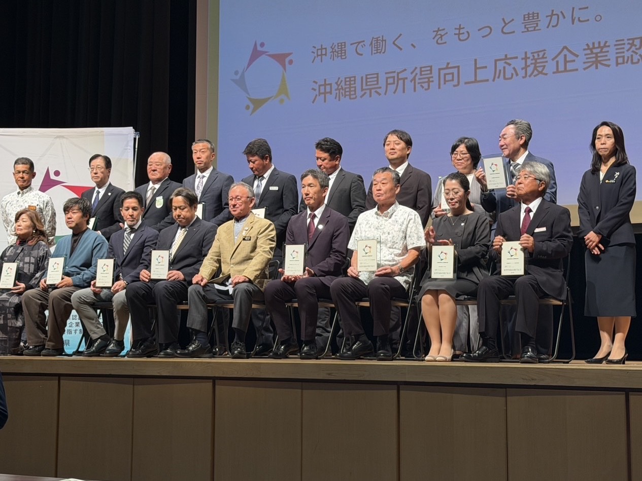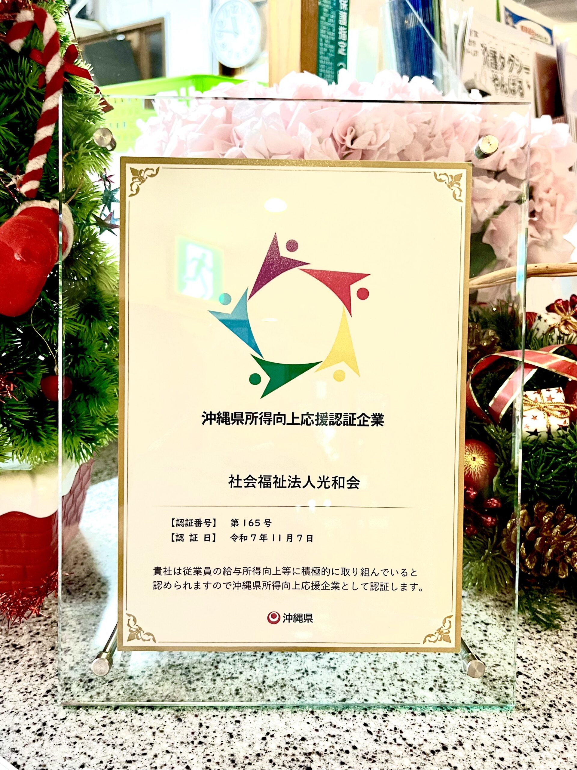 2025年12月16日(火)、那覇市にある新報ホールにて「沖縄県所得向上応援企業認定式」が開催され、社会福祉法人光和会が認証企業として認証されました。